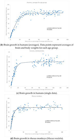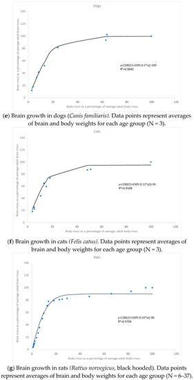 Yet again, the logistic equation provided good approximation (R2 = 0.90–0.99) to the growth of brain vs. body size in all placental mammal species falling into this group (humans, rhesus monkeys, dogs, cats, rats, and mice) (Figure 2a–g).