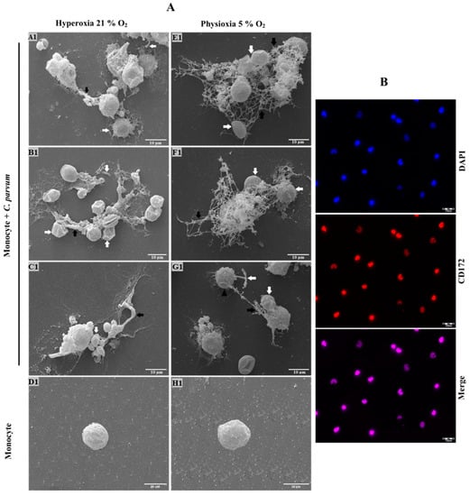 SEM analysis was utilized to evaluate the Cryptosporidium parvum-induced suicide METosis (n = 3) under physioxic (5% O2) and hyperoxic (21% O2) circumstances. (A) Oocysts of C. parvum were exposed to isolated bovine monocytes and thereafter fixed for SEM analysis. The presence of filaroid structures resembling METs, characterized by their delicate and thick nature, was revealed, as indicated by the black arrows. The occurrence of extruded suicidal METosis is characterized by the observation of tightly entrapped oocysts and sporozoites (indicated by white arrows) within ruptured monocytes. Moreover, inactivated monocytes (D1,H1) with rough surfaces and activated cells (G1, black arrow heads) were also detected in these reactions but without complete cell disruption. (B) The CD-172+ marker was used for monocyte confirmation.