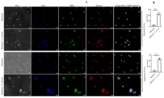 (A) The METosis phenomenon (n = 3), induced by Cryptosporidium parvum, is distinguished by the convergence of monocyte-derived DNA (blue) embellished with myeloperoxidase (MPO, green) and global histones (H1, H2A/B, H3, H4, red), leading to the amalgamation of the aforementioned three channels. (B) METs percentage is shown as well for both oxygen concentrations.