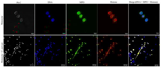 Cryptosporidium parvum-triggered suicidal METosis (n = 3) is demonstrated using confocal microscopy by co-localization of monocyte-derived DNA (blue) decorated with myeloperoxidase (MPO, green), histones (H1, H2A/B, H3, H4, red), and the resulting merging of the three channels.