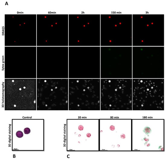 Investigating live-cell 3D-holotomographic microscopy to observe the interactions between monocytes and C. parvum (sporozoites/oocysts) in a three-dimensional environment. (A) depicts a time-lapse visualization of monocytes that have been subjected to staining with SYTOX Green® and DRAQ5®. (B) demonstrates the utilization of 3D-digital staining technique for the visualization of control experiment involving inactivated monocytes. (C) The study utilized three-dimensional digital staining to illustrate the morphological changes that monocytes exposed to C. parvum underwent at 20, 80, and 180 min of stimulation, respectively.