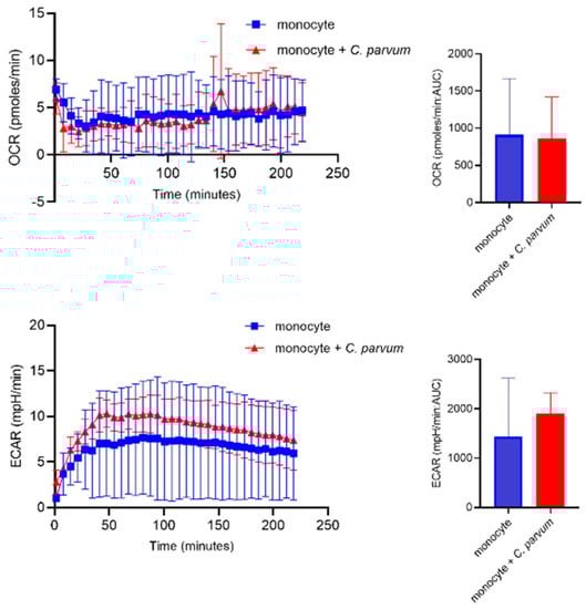 Assessment of the metabolic changes that occur in bovine monocytes when exposed to Cryptosporidium parvum. Evaluation of oxygen consumption rate (OCR) and extracellular acidification rate (ECAR) in bovine monocytes using an extracellular flux analyzer (Seahorse®; Agilent) following injection of C. parvum into the plate. Measured OCR- and ECAR concentrations during 220 min. The area under the curve (AUC) was calculated for all registries and given as mean ± SD.