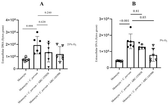 The impact of treatments with AR-C 155858 and AR-C 141990 on suicidal METosis (n = 6) induced by Cryptosporidium parvum. Hyperoxic (A) and physioxic (B) co-culture conditions. Bovine monocytes were subjected to a pre-treatment of AR-C 155858 (1 μM) and AR-C 141990 (1 μM) for a duration of 30 min. Following this, during a 3 h time frame, monocytes were subjected to C. parvum. The assessment of extracellular DNA was conducted by measuring fluorescence intensities derived from SYTOX Green® using multi-plate reader (Varioskan®, Thermo Scientific). The graphs present the mean value along with the standard deviation (SD), and statistical significance was determined by a p-value less than 0.05.