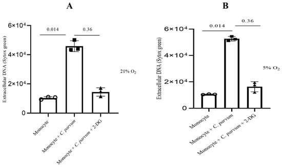 The impact of glycolysis under hyperoxic (A) and physioxic (B) conditions during Cryptosporidium parvum-induced METosis. Before exposing bovine monocytes (n = 3) to C. parvum (in a proportion of 1:3) for three hours, they were given a pre-treatment of 2 mM for 2-DG (30 min), which is an inhibitor of glycolysis. The fluorescence intensities of SYTOX Green® were measured using an automated multi-plate reader (Varioskan®, Thermo Scientific) to evaluate extracellular DNA. Results show mean ± SD and p values less than 0.05 as statistically significant.