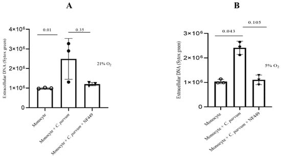 The effects of hyperoxia (A) and physioxia (B) on P2X1-mediated purinergic signaling in C. parvum-induced METosis. Bovine monocytes (n = 3) were subjected to pre-treatment with NF449 (100 μM), a P2X1 inhibitor, for a duration of 30 min prior to being exposed to C. parvum (proportion 1:3) for a period of 3 h. The fluorescence intensities of SYTOX Green® were measured using an automated multi-plate reader (Varioskan®, Thermo Scientific) to evaluate extracellular DNA. The reported results in the graphs consist of the mean ± SD of the mean. Statistical significance was determined by p-values less than 0.05.