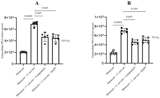 Freshly isolated monocytes co-cultured with C. parvum sporozoites in the ratio of (1:3) in 21% O2 (hyperoxia) [,,] and 5% O2 (physioxia) circumstances [,]. As has already been documented by Vélez et al. [,], physioxic conditions were established using an InvivO2® 400 physiological system (Ruskinn, Vienna, Austria), while hyperoxic (21% O2) co-culture conditions were established using a standard cell culture incubator (Heracell 240i, Thermo Fischer Scientific, Braunschweig, Germany). 1 × 106 cells/mL (n = 5) was in sterile 1× HBSS buffer (Sigma-Aldrich, Darmstadt, Germany) and subjected to two different oxygen conditions. Subsequently, SYTOX Green® (5 µM; Thermo Fisher Scientific, Braunschweig, Germany) was introduced into the sample. A total of 1 × 105 cells were seeded in each well of a transparent plastic microplate, with a volume of 50 μL per well (96-well plate; Greiner, Frickenhausen, Germany). The Notch signaling pathway inhibitors, namely compound E at a concentration of 20 nM and DAPT at a concentration of 50 μM (both obtained from Merck Millipore, Darmstadt, Germany), were introduced. In each experimental condition, a quantity of 3 × 105 C. parvum sporozoites was introduced per well. The experiment involved culturing plates under both physioxia and hyperoxia conditions. The extracellular DNA release, which leads to the formation of METs, was tracked over a 120-min period using an automated multi-plate monochrome reader (Varioskan Flash®; Thermo Fischer Scientific, Braunschweig, Germany). The fluorescence emitted was measured by the reader at two-minute intervals, utilizing an emission wavelength of 523 nm and an excitation wavelength of 504 nm.