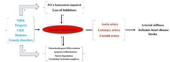Typically, the aortic artery, the coronary artery, and both the internal and common carotid arteries are the main blood vessels in which vascular calcification occurs []. Notably, detachment of a calcium phosphate crystal from these arteries can induce an episode of ischemia, mainly in the heart or brain (Figure 1). Moreover, vascular calcification is frequently associated with aging, progeria (accelerated aging), and diseases that accelerate aging, such as diabetes and end-stage chronic kidney disease (hemodialysis). Moreover, certain genetic diseases are linked to ectopic calcification, including vascular calcification. Examples of such conditions include pseudoxanthoma elasticum, generalized arterial calcification of infancy, familial idiopathic basal ganglia calcification (type 1), and diffuse idiopathic skeletal hyperostosis.