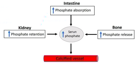 Considering the vital roles of phosphate in crucial cellular processes, it is unsurprising that deviations from normal serum phosphate concentrations can lead to severe clinical disorders. Phosphate deficiency typically results in anemia, rhabdomyolysis, muscle weakness, abnormal bone mineralization, and impaired leukocyte function. However, patients with severe malnutrition and people with genetic phosphate regulation disorders can induce hypophosphatemia []. In addition, some medications can have an adverse effect on phosphate levels, and phosphate can interact with certain medications []. Moreover, several diseases are correlated with phosphate homeostasis dysregulation, including diabetes mellitus, chronic kidney disease, vitamin D-related diseases (hyper- and hypovitaminosis), osteoporosis, and hyperparathyroidism [,]. Notably, the increased absorption or decreased excretion of phosphate can induce a relatively small hyperphosphatemia, which is correlated with vascular calcification due to the saturation of inhibition or increased calcium phosphate crystal formation.
