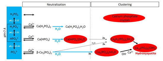 Notably, various salt types are obtained by the charge neutralization of these different inorganic phosphate ions with calcium ions [], including (1) monocalcium phosphate anhydrous (Ca(H2PO4)2), (2) dicalcium phosphate anhydrous (CaHPO4), and (3) β-tricalcium phosphate (β-Ca3(PO4)2) []. Both Ca(H2PO4)2 and CaHPO4 are hydrated to generate monocalcium phosphate monohydrate (Ca(H2PO4)2H2O) and dicalcium phosphate dihydrate (CaHPO42H2O), respectively. CaHPO42H2O, also called brushite, is often found in calcified tissues, whereas Ca(H2PO4)2, Ca(H2PO4)2H2O, CaHPO4, and β-Ca3(PO4)2 have never been found in calcifications. Interestingly, whitlockite (the Mg-substituted β-tricalcium phosphate form) has been found in some calcified tissues, such as the aorta, in hemodialysis patients [,] but does not form under physiological conditions.