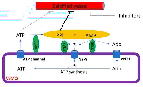 To prevent the formation of hydroxyapatite crystals, the body produces inhibitors of calcification using adenosine-5′-triphosphate (ATP), including proteins and low-molecular-weight inhibitors. Recent work provides evidence that the purinergic system plays an important role and, in particular, has links to extracellular pyrophosphate metabolism []. Extracellular pyrophosphate is the main endogenous inhibitor of vascular calcification [], which is produced via the hydrolysis of extracellular ATP []. Moreover, ATP directly inhibits calcium phosphate deposition [], which is a molecular mechanism similar to pyrophosphates, bisphosphonates (nonhydrolyzable analogous to pyrophosphate), and polyphosphates [,,]. Enzymes and transporters involved in extracellular ATP/pyrophosphate metabolism include alkaline phosphatase, members of the ENPP and eNTPD families, ecto-5′-nucleotidase [], equilibrative nucleoside transporters [], phosphate transporters [,], and pumps/channels that release ATP extracellularly [,].