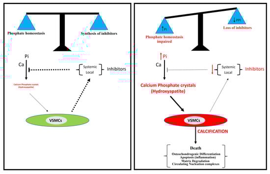 Several studies suggest two principal processes involved in vascular calcification: a passive process and an active process. The formation and deposition of calcium phosphate crystals, mainly in the form of hydroxyapatite, is a passive process that does not require cellular activity and in which hyperphosphatemia is a critical risk factor. However, the synthesis of calcification inhibitors requires the active cellular synthesis of ATP. In relation to this, two main mechanisms are involved in the active process of calcification (Figure 6): the impairment of phosphate homeostasis (which leads to hyperphosphatemia) and the loss of inhibitor synthesis (which mainly leads to pyrophosphate deficiency).
