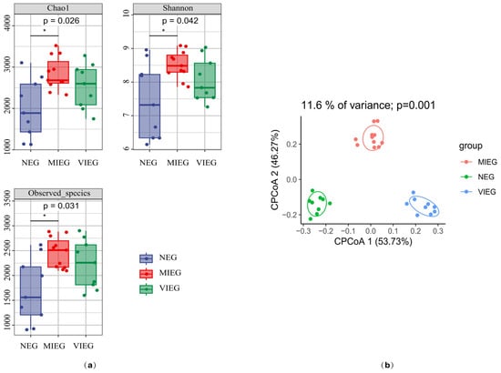 Gut microbiome profiles were analyzed across different exercise intensities. (a) Alpha diversity estimates of the bacteria communities were compared using Kruskal–Wallis test (p < 0.05). (b) Cluster-based principal coordinate analysis (CPCoA) was conducted at the ASV level using Bray–Curtis distance to compare the data between groups. The groups included the non-exercise group (NEG), moderate-intensity exercise group (MIEG), and vigorous-intensity exercise group (VIEG). * p ≤ 0.05.