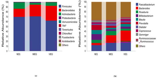 Ten phyla, including Firmicutes, Bacteroidetes, Actinobacteria, Proteobacteria, Verrucomicrobia, TM7, Tenericutes, Chloroflexi, Fusobacteria, and Acidobacteria, were identified using the Greengenes reference (13.8) database for all samples. Unclassified reads in the bacteria phylum were removed from the sequencing data. In Figure 2a, it can be observed that the bacteria in the non-exercise group (NEG) primarily consist of Firmicutes (69.42%), Bacteroidetes (16.72%), and Actinobacteria (12.85%). In contrast, the moderate-intensity exercise group (MIEG) and vigorous-intensity exercise group (VIEG) were predominantly composed of Firmicutes (70.54% and 61.82%, respectively), Bacteroidetes (23.78% and 30.09%, respectively), and Actinobacteria (3.88% and 7.07%, respectively) at the phylum level.