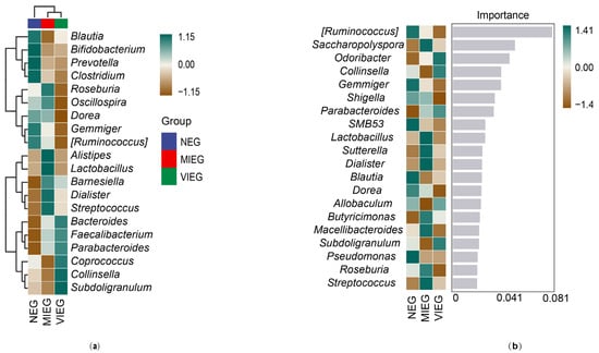 To explore the differences in microbial community composition (beta diversity) primarily attributed to species distribution, two approaches were employed. Firstly, a heatmap was used to compare the variations in species composition between groups and analyze the distribution trends of species abundance within each group. The heatmap was based on the abundance data of the top 20 genera with average abundance (Figure 3a). Secondly, the random forest algorithm was utilized to identify potential taxonomic biomarkers and classify microbial community samples effectively, robustly, and accurately (Figure 3b).