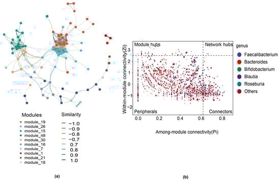 The network diagram showed a strong positive correlation between Ruminococcaceae and Christensenellaceae (Spearman’s r = 0.88; p < 0.01) and Butyricicoccus and Rikenellaceae (Spearman’s r = 0.85; p < 0.01) (Figure 4a). Zi and Pi score values were calculated for each node in the current co-occurrence network, based on the modular segmentation results. The Zi value represents the within-module connectivity of each node, while the Pi value represents the connectivity among modules. The role of each node in the network was determined based on their Zi and Pi score values. Through analysis, the species identified at the genus level are Faecalibacterium, Bacteroides, Bifidobacterium, Blautia, and Roseburia (Figure 4b).