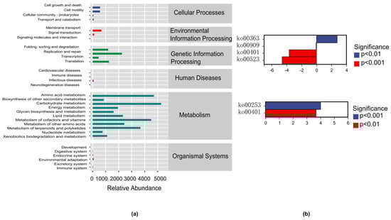 Microbial ecology research also focuses on assessing the functional potential of microbial communities. The core of the KEGG database is the Biological Metabolic Pathway Analysis Database (KEGG Pathway Database), (http://www.genome.jp/kegg/pathway.html, accessed on 7 June 2024). Among them, metabolic pathways were classified into six categories, including metabolism, genetic information processing, environmental information processing, cellular processes, organic systems, and human diseases. Each type of metabolic pathway was further divided into multiple levels. At present, the second level included a total of 45 metabolic pathway subfunctions, the third level corresponds to the metabolic pathway map, and the fourth level corresponds to various KO groups (KEGG orthologous groups) on the metabolic pathway (Figure 5).