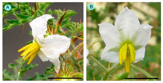 Two types of flowers of Solanum sisymbriifolium. (A) Fertile bisexual flower and (B) female-sterile flower. Scale bars = 20 mm.