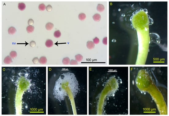 (A) Pollen viability test using the TTC staining method (v—viable, nv—non-viable), (B–F) stigma receptivity test using H2O2 (different ages of flowers: (B)—bud condition, (C)—1st day, (D)—2nd day, (E)—3rd day, (F)—4th day).