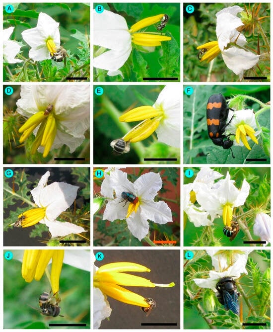 Flower visitors of Solanum sisymbriifolium in West Bengal. (A) Amegilla zonata, (B) Brounsapis mixta, (C) Ceratina binghami, (D) Epuraea luteola, (E) Halictus (Seladonia) lucidipennis, (F) Hycleus phalarantha, (G) Lasioglossum cavernifrons, (H) Lucilia sericata, (I) Nomia (Curvinomia) strigata, (J) Paragus serratus, (K) Tetragonula pagdeni, and (L) Xylocopa fenestrata. Scale bars = 10 mm.