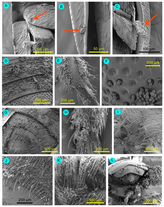 Showing attachment of pollen grains on insect body parts. (A–C) Illegitimate visitor, beetle Epuraea luteola. (A) Pollen attached to the segment of the leg, and (B,C) the margin of the wing. Arrows are showing attached pollen grains. (D–L) Legitimate visitors. (D–F) Ceratina binghami (ventral abdomen, leg, and ventral thorax, respectively), (G–I) Lasioglossum cavernifrons (ventral abdomen, leg, and ventral thorax, respectively), (J,K) Nomia (Curvinomia) strigata (ventral abdomen and ventral thorax), (L) Tetragonula pagdeni (pollen grains on legs and ventral abdomen and thorax).