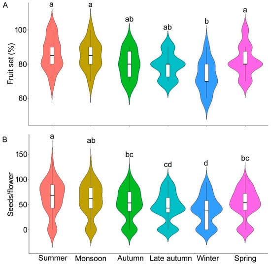 Fruit and seed sets were observed under open-field (i.e., unmanipulated) conditions throughout all seasons. In the morning, newly opened flowers (characterised by greenish-yellow anthers) were selected and marked by applying an ink spot to the pedicel and adding tags (n = 10 × 10 = 100 flowers per season, with ten sampling days per season). Subsequently, fruit and seed sets were recorded, following the same procedure as in the previously described pollination treatment experiment.