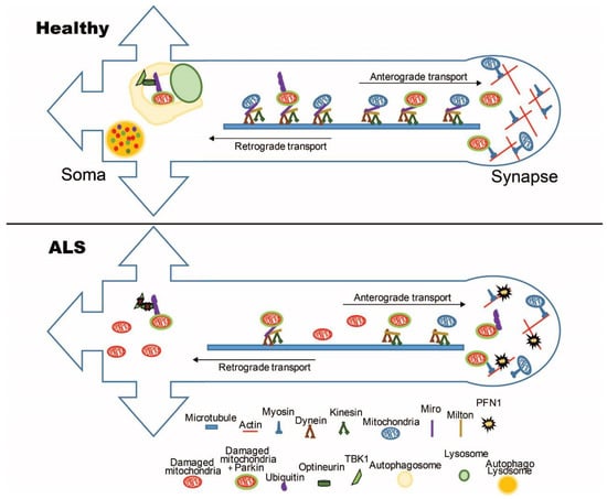 In neurons, mitochondria are highly dynamic organelles. They are characterized by fast transport along neuronal axons, in both anterograde and retrograde directions (i.e., from the soma to the periphery and vice versa). Mitochondria from the soma are anterogradely transported to sites where metabolic demand is high, such as the synapse [,], while retrograde transport provides essential information regarding the status and environment of distal sites. Thus, mitochondrial transport plays an essential role in maintaining healthy motor neurons, and alterations of rate-limiting components of the mitochondrial transport machinery may cause an imbalance of mitochondrial distribution in neurons. Furthermore, as active lysosomes are mostly localized in the soma, damaged mitochondria in axons are engulfed in autophagosomes and retro-transported to the soma to be degraded upon fusion with lysosomes []. Defective retrograde transport of autophagosomes could result in a delay of mitochondrial autophagy (mitophagy) fluxes and accumulation of damaged mitochondria. Thus, axonal transport and mitophagy are intimately interconnected processes.