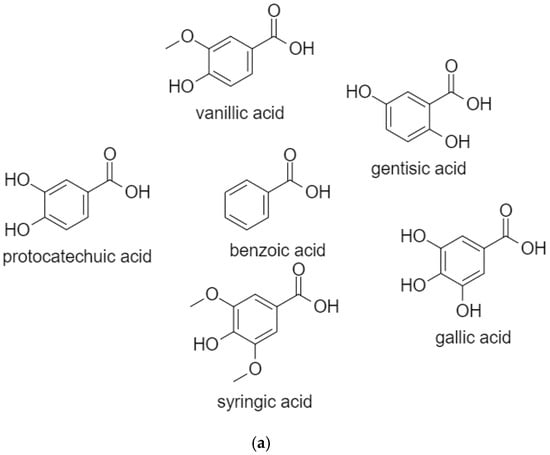 (a) Benzoic acids: vanillic, gentisic, protocatechuic, gallic, and syringic acid; (b) Cinnamic acids: caffeic, ferulic, p-coumaric, and sinapic acid.