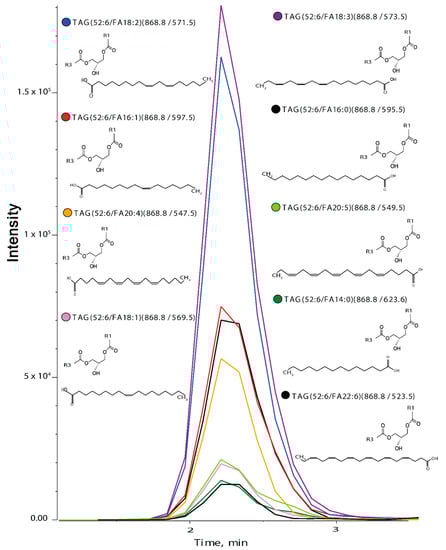 Current methods for large-scale lipid analysis can only identify the lipid classes and total fatty acyl composition of lipid species but the structure specificity is critical for studying the biological function of lipid species. Finding the composition of fatty acyl chain with respect to sn-position is a major limitation in large scale lipidomics studies [,]. Using pseudo-transitions for identifying TAG has its own disadvantages []. Firstly, it is based on same Q1 and Q3 m/z value (e.g.: 868.8/868.8), other compound which has same parent mass (Q1) with similar polarity, will also be eluted at same time and MS cannot differentiate between two compounds. So, scanning unique pair of Q1/Q3 transition, where Q1 is parent ion and Q3 is characteristic daughter ion, for that compound is essential. Secondly, isomers cannot be detected as Q3 is same as Q1. Recently using a combination of photochemical reaction (Ozone-induced dissociation and ultraviolet photo-dissociation) with tandem MS, Cao et al. reported the identification of isomers for TAGs and PLs on the basis of sn-position and carbon-carbon double bond (C=C) []. Their identification also revealed the sequential loss of different fatty acyl chain based on sn-position, disclosing identification of different positional isomers []. However, a single step identification of TAG isomers in large scale studies remains a challenge due to the three fatty acyl chains with glycerol backbone, bearing no easily ionizable moiety [,,]. We have focused on identification of structural isomers based on sn-position using LC-MS platform, without adding extra steps to burden the analysis time and effort. We were able to detect structural isomers with respect to fatty acyl chain at sn-position where the neutral loss of one of the sn-position fatty acyl chain (RCOOH) and NH3 from parent ion [M+NH4]+ makes their detection possible. Detection was purely based on assigning a unique combination of Q1/Q3 for structural isomer of TAG species (Figure 3a). However, one of the limitations of this method is the inability to assign fatty acyl group (sn1, sn2, or sn3) to their respective sn-position. Hence, the three fatty acyl chains are represented by the adding the number of carbon atoms and unsaturation level (e.g., TAG (52:6) and the identified fatty acid at one of the sn-position (e.g., FA-14:0) is represented by TAG (52:6/FA14:0).