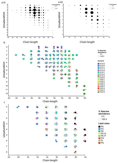 Abundance of different lipids. (a(i)) Abundance of different TAGs on the basis of total chain length (as a function of main-chain carbon atoms) and unsaturation. (a(ii)) Abundance of different phospholipids on the basis of total chain length and unsaturation. (b) A total of 339 TAG isomers were detected from 77 different species of TAG. (c) Abundance of 365 phospholipids belonging to 6 classes (PC, PE, PG, PI, PS, and PA), different dots of same color represent isomers. The abundance of the difference lipids/isomers is represented by the varying size of the bubble in all of the panels.