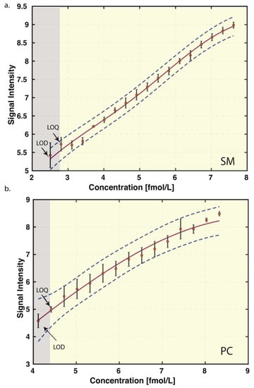 The raw analytical signal in blank was considered for establishing the LoB, which was determined from the area under the chromatogram for the selected transition of each lipid standards. The LoD and LoQ were obtained from the raw analytical signal (area under the chromatogram) obtained by progressively diluting the lipid standards. The LoD and LoQ were based on the average values obtained in three replicates, reflecting inter day variability as mentioned in the materials and methods section. A representative graph of LoD and LoQ for SM (positive mode) and PC (negative mode) is shown in Figure 4a,b, while the values of LoD and LoQ for other lipid classes are provided in Table 1. The LoDs were in range of 0.245 pmol/L–41.961 pmol/L except for DAG (1 nmol/L). Detection limit for SM, LPC, PE, and PG were found to be in femtomolar range, while the rest were in the picomolar range. The lowest LoQ was detected for PG- 0.291 pmol/L and highest for DAG- 2 nmol/L.