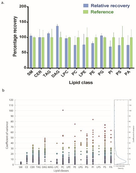 Validation of the method. (a) Spike and recovery of different lipid classes where blue bars represent the recovery of lipids when known concentration of lipid standards was spiked during extraction and green bars represents the reference (same concentration of lipid standard spiked after extraction). (b) Coefficient of variance on day 2 where 1043 lipid species from 16 lipid classes were detected (n = 5). The color scale of the bubble is based on the function of coefficient of variance in the increasing order. The right-hand panel represents the density function w.r.t. coefficient of variance.