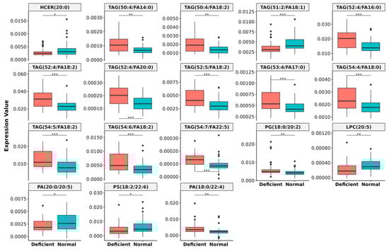 Significantly altered lipid species in vitamin B12 deficiency. The significance level for different lipid species are represented by p-value ( * = p < 0.05, ** = p < 0.01 and *** = p < 0.001).