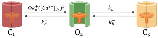 Cardiomyocyte CRUs in a cardiac dyad consist of couplons where L-type calcium channels (LCCs) in t-tubules are co-localized with ryanodine receptors (RyR2s; type 2 in cardiac cells) in a junctional SR (JSR) membrane. The 20,000 CRUs in this model are composed of 9 individual LCCs and 49 RyRs. These CRUs are intricately connected through the complex organization of the network SR (NSR) which stores the main intracellular calcium in cardiac muscle cells. Similarly, the CRUs are all connected to the bulk myoplasm without any spatial arrangement of release units. To capture the Ca2+ release from CRUs, this model includes 3-state ryanodine receptor mode switching (Figure 2) which incorporates cytosolic calcium-dependent and luminal calcium-dependent gating from Paudel and co-workers []. A luminal dependence function modulated RyR open probability to match calcium spark characteristics from Williams et al. [] and also incorporated minimal adjustments to allosteric coupling energies (Appendix A.2). The second closed state (C3) is the RyR2 adaptive state from changes in [Ca2+]i.
