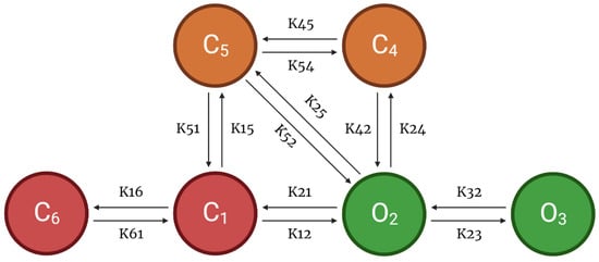 As another component of the CRU, this model also incorporates a 6-state l-type Ca2+ channel which is modeled via two pathways—voltage-dependent or Ca2+-dependent inactivation of opening states (Figure 3). Following Hoang-Trong and co-workers [], C6 state was added to the 5-state original model from Sun et al. [] to accommodate stronger depolarization (from −30 mV to −40 mV). This was formulated in order for all the channels to stay in this state (C6) when the cell is at rest. The source of entrant Ca2+ to this subspace is the influx of calcium via LCCs and calcium release from SR via RyR2s. When a higher level of Ca2+ enters this subspace, it enhances the rate of inactivation of LCC and thereby prevents calcium overload [].