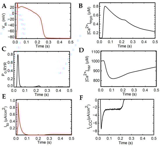 Several 1 Hz baseline simulations. (A) APD ~0.280 s. (B) Transient calcium ([Ca2+]myo) representing the increase and reduction in cytosolic Ca2+. (C) RyR open probability rises during the phase of cell depolarization. (D) SR Ca2+ recovery from base concentration of 1000 µM. (E) Modified transient outward K+ current (Ito) amplitude ≤ 1 µA/cm2 which is similar to tissue experiments. (F) ILCC shape and amplitude closely resemble experimental recordings from epicardial action potentials.