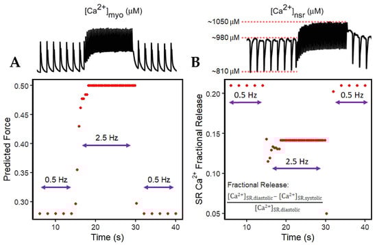 SR Ca2+ release is rarely measured directly and is most often assumed to be proportional to the measured [Ca2+]i transient peak []. [Ca2+]i binds to troponin, resulting in the sliding of the thick and thin filaments and the development of pressure within the ventricle []. It was previously described by Bassani et al. that the effect of SR Ca2+ load on fractional SR Ca2+ release may display a relationship to the regulation of the Ca2+ release channel, meaning that the increased intra-SR Ca2+ increases the sensitivity of the SR Ca2+ release channel to a given cytosolic Ca2+ trigger []. This phenomenon has been observed experimentally in ferret and rat ventricular cardiomyocytes, wherein fractional SR Ca2+ release also increases SR Ca2+ load [,]. However, this increase in fractional SR Ca2+ release with higher SR Ca2+ load was conducted by the application of caffeine or by manually increasing the extracellular calcium ([Ca2+]o) available to be released, specifically during varied loads with altering [Ca2+]o concentrations from 500 µM to 8 mM (see [] for a review of methodology). Early studies exploring SR Ca2+ release suggest that this Ca2+ release is proportional to the measured [Ca2+]i amplitude. Predicted steady state force depends on the amount of Ca2+ bound to troponin, and this can be measured through a modified Hill Equation (9). There is initially less driving force for the Ca2+ sequestration back into the SR via SERCA and Ca2+ extrusion out of the cell mainly caused by INCX upon the sudden application of rapid stimulus (from 0.5 to 2.5 Hz as demonstrated). Moreover, the release of SR Ca2+ in cardiac muscle during excitation–contraction coupling is known to be graded by the amount of activating calcium outside the SR, which is defined as a calcium-induced, calcium-release event []. In rabbit left ventricular epicardium recordings, the difference between diastolic and systolic SR Ca2+ exhibits a frequency-dependent response, and diastolic SR Ca2+ increases quickly to a new steady state as the pacing rate also increases []. From the smaller difference between diastolic and systolic SR Ca2+ during incomplete SR recovery discussed in Figure 6B, SR Ca2+ fractional release is observed to be decreased at faster rates.