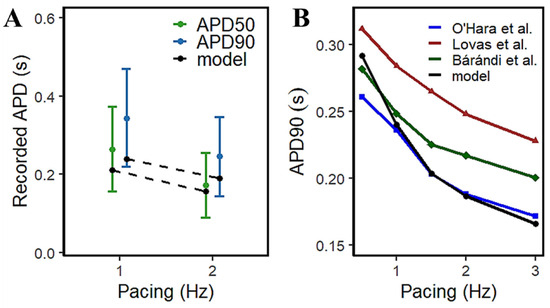 The access to isolated animal cardiac tissues for exploring AP morphology has been increasingly viable for approach, but the availability of isolated human cardiac samples has always been expected to be scarce. However, a relatively large study by Page et al. [] provided a rate-dependent response in APD using 96 human ventricular trabeculae from 20 human heart donors (Figure 7A) which provides a range of acceptable values for human APD measurements. From their observations, the increase in pacing rate resulted in a decrease in APD—at 1Hz, APD90 is between 0.224~0.471 s and APD50 is between 0.156~0.373 s; at 2 Hz, APD90 is within 0.145~0.347 s and APD50 within 0.089~0.255 s. The model presented here exhibits similar AP duration at simulated frequency settings to other experimental results in the literature (Figure 7B).