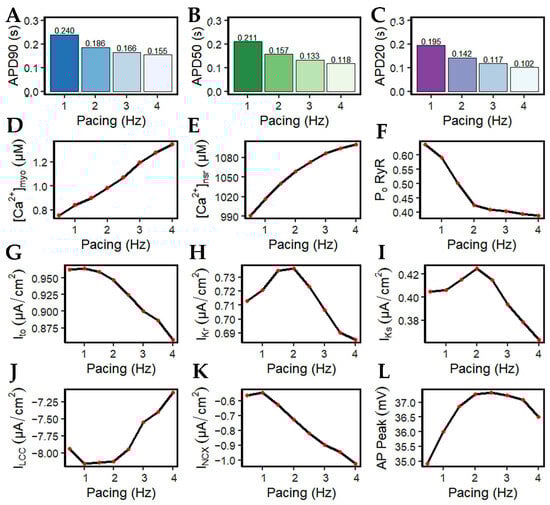 It has been long established that AP duration is directly related to the corresponding beating rate (Figure 8A–C). With the increasingly frequent stimulus applied to the cell during higher pacing, peak myoplasmic Ca2+ concentration also increases (Figure 8D) due to the growing inability of the sarcoplasmic reticulum Ca2+ ATPase pump (SERCA2), sodium-calcium exchange (NCX), and plasmalemmal Ca2+ ATPase pump (PMCA) to fully deplete the Ca2+ ions of the cell. Due to the increasing myoplasmic Ca2+ concentration, peak SR Ca2+ content ([Ca2+]nsr) at diastole also increases up to ~1100 µM at 4 Hz (Figure 8E). This phenomenon is also referred to as SR Ca2+ loading. Accompanied by the greater influx of Ca2+ into the cell, the peak open probability of RyR2s decreases with high pacing (Figure 8F) ([,]; see also [] for a review) as a consequence of inactivation by higher Ca2+ concentrations.