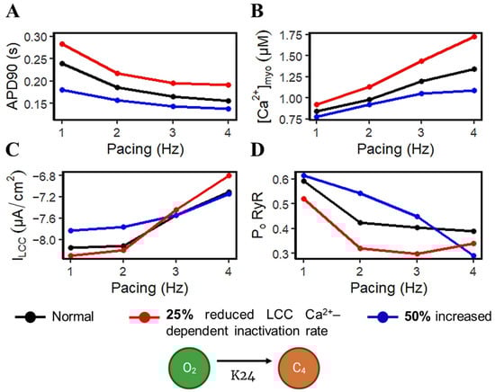 APD shortening in higher pacing is presumably an effect of the decreasing ILCC and RyR2 open probabilities in Figure 8. In order to test if the l-type calcium channel is a primary contributor in APD shortening, we varied the calcium-dependent inactivation rate from the six-state LCC model in Figure 3 (O2 → C4: K24). Overall, the increased inactivation rate exhibits shorter APD90s while the reduced inactivation rate shows longer APD90s (Figure 9A). Lower [Ca2+]myo concentration was also observed at an increased LCC inactivation rate (Figure 9B), which could also contribute to a shorter AP duration. Decreased ILCC peak density and higher RyR2 open probability were also observed up to 3 Hz (Figure 9C,D) due to the same conditions of increased LCC inactivation. However, the RyR2 open probability is evidently decreased at 4 Hz during the increased inactivation rate, because RyR2 opening goes further into the adapted state as previously discussed in Figure 5D (see Appendix A, Figure A8 and Figure A9 for LCC and RyR states). In contrast, due to the increased opening of the ILCC in the case of 25% reduced LCC inactivation, more calcium is entering the cell. As previously discussed, RyR clusters can spontaneously close at increased concentrations of Ca2+, hence its decreased amplitude under the same conditions (Figure 9D, red line).