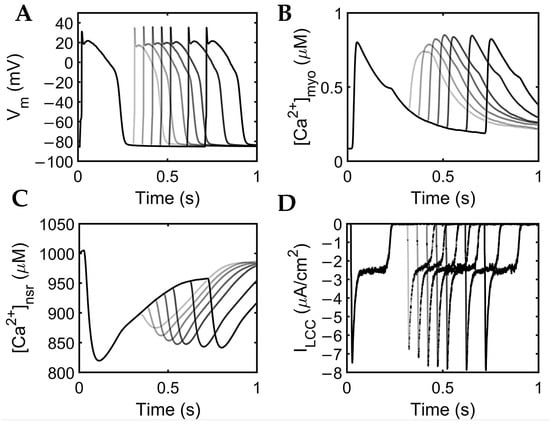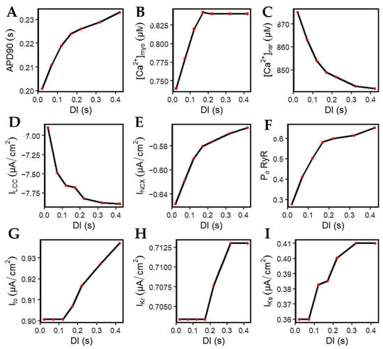 It was demonstrated by Banyasz et al. [] that INCX presents an outward (positive) current at the beginning of the AP, turns into a small inward current at early phase two, then inward (negative) INCX increases at phases three and four. Specifically, they assert that ILCC is the dominant inward current during AP phases one and two, whereas INCX is the dominant inward current during phases three and four []. The model in this study observes that the inward current of INCX decreases (becomes less negative) at longer DIs (Figure 11E), meaning that Ca2+ extrusion is also decreased. This explains its contribution to longer APD, because Ca2+ stays longer inside the cell.