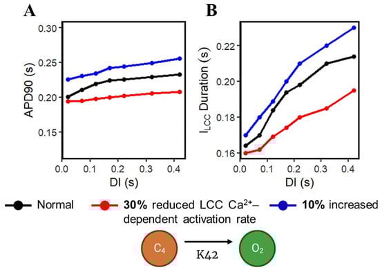 Calcium-cycling dynamics evidently have important effects on APD, specifically its mediation through calcium-sensitive currents such as the L-type calcium channel. It was previously suggested by Qu et al. [,] that the kinetics of ILCC recovery, rather than its amplitude, should modulate its effects on APD restitution and slope (see Appendix A, Appendix Figure A10 for the restitution slope experimental comparisons). In order to confirm this phenomenon, the calcium-dependent activation rate from the six-state LCC model in Figure 3 (C4 → O2: K42) was varied and each ILCC opening duration was measured. In all cases, APD90s show longer duration on increasing diastolic intervals by the S1S2 restitution protocol (Figure 12A). Moreover, as expected, the APD90 with 10% increased LCC calcium-dependent activation rate exhibited longer APD90s than normal and reduced cases. On the other hand, a similar trend is exhibited by the ILCC opening (in seconds), wherein all cases increase in duration at longer diastolic intervals and the 10% increased calcium-dependent activation rate shows longer opening times (Figure 12B). This indicates that the L-type calcium channel open duration has direct contribution to APD’s S1S2 restitution (see Appendix A, Appendix Figure A11, for ILCC states).