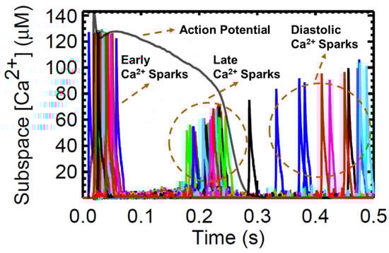 Ca2+ sparks are discretized calcium release events due to random and collective openings of the RyR2 channels clustered in a CRU. On a fundamental level, these sparks result from spontaneous openings of single SR calcium-release channels, which are supported by ryanodine-dependent changes of spark kinetics []. The RyR is both the SR Ca2+ release channel and a scaffolding protein that localizes key regulatory proteins such as calmodulin, calsequestrin, and other proteins at the luminal SR surface []. Local CRU Ca2+ sparks were investigated using the mathematical model of Williams et al. [] which includes spatial nanodomain determinants of individual CRU organization and a realistic number of 20,000 CRUs. Systolic transient [Ca2+]i activates L-type Ca2+ channels at the surface membrane and at transverse tubules which then elevates [Ca2+]i locally in the dyadic subspace compartment between the t-tubular and terminal SR membranes. This situation is amplified when RyR2 clusters are activated by locally elevated subspace [Ca2+]ds during CICR (see [] for the physiological review). This spontaneous local increase in intracellular calcium concentration from the SR produces calcium sparks (Figure 13). Moreover, as previously described, SERCA sequesters Ca2+ back into the SR storage. During resting SERCA activity, an “SR Ca2+ leak” or Ca2+ efflux from the SR is present in late phase of Ca2+ release during AP, and this leak has been proposed to take the form of spontaneous Ca2+ spark activity [].