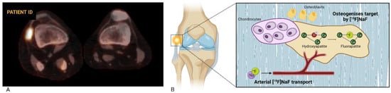 In inflammatory bone disorders, such as rheumatoid arthritis and ankylosing spondylitis, [18F]NaF PET was able to identify sites with active bone formation rather than inflammation [,]. This was confirmed by a study by Bruijnen et al. in which bone biopsies of [18F]NaF PET-positive lesions revealed active bone formation []. In rheumatoid arthritis, significantly higher uptake values were found in erosive joints compared to non-erosive joints, and accumulation of [18F]NaF was associated with ongoing bone damage []. [18F]-Fluorodeoxyglucose (FDG) PET also showed increased tracer uptake in erosive joints, where it concentrated in the joint space, whereas [18F]NaF uptake was measured in the bone cortex, likely reflecting upregulated bone turnover.