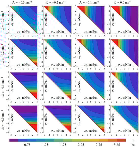 Dependence of normalized gA dimer lifetime τ/τ0 on lateral tensions in the outer (σu) and inner (σl) monolayers for different values of spontaneous curvature of the outer (Ju) and inner (Jl) monolayers. The values of τ0 were obtained as the limit of τ when (σu, σl) → (0, 0), corresponding to plasma membranes of cells or deflated GUVs. In white triangles in left-lower corners of the plots, σu + σl < 0, and the membrane is mechanically unstable. Thus, only right-upper halves of the plots are displayed.