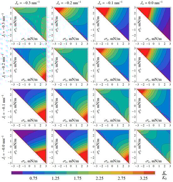 Dependence of normalized gA dimer–monomer equilibrium constant K/K0 on lateral tensions in the outer (σu) and inner (σl) monolayers for different values of spontaneous curvature of the outer (Ju) and inner (Jl) monolayers. The values of K0 were obtained as the limit of K when (σu, σl) → (0, 0), corresponding to plasma membranes of cells or deflated GUVs. In white triangles in left-lower corners of the plots, σu + σl < 0, and the membrane is mechanically unstable. Thus, only right-upper halves of the plots are displayed.