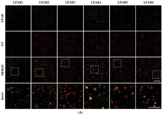 Frozen human brain tissue sections were mounted on glass slides. The slides were fixed in 4% paraformaldehyde for 20 min at room temperature. Permeabilization was achieved with 1% Triton X-100 in PBS for 30 min. After rinsing with PBS, the slides were blocked with 5% normal goat serum (NGS) in PBS for 1 h at room temperature to minimize nonspecific binding. The primary antibodies used were mouse anti-NeuN (1:500, #MAB377, EMD Millipore, Billerica, MA, USA), rabbit anti-Iba1 (1:500, 019-19741, Wako, Osaka, Japan), FITC-anti-CD11b (1:100, 101206, Bio Legend, San Diego, CA, USA), mouse anti-mouse GFAP (1:500, 3670S, CST, Danvers, MA, USA), rabbit anti-LPAR1 (1:500, ALR-031, Alomone labs, Jerusalem, Israel), rabbit anti-LPAR2 (1:500, ALR-032, Alomone labs), rabbit anti-LPAR3 (1:500, ab23692, Abcam, Cambrighe, UK), rabbit anti-LPAR4 (1:500, ALR-034, Alomone labs), rabbit anti-LPAR5 (1:500, ALR-035, Alomone labs), and rabbit anti-LPAR6 (1:500, ALR-036, Alomone labs). The secondary antibodies were conjugated to Alexa Fluor 488, 568, and 647 (1:500; Invitrogen, Waltham, MA, USA). For gintonin (GT) detection, GT was conjugated to FPRTM 675 (Bioacts, Incheon, Republic of Korea). DAPI (17984-24, Electron Microscopy Science, Hatfield, PA, USA) was applied to the tissue, and a cover slip was mounted.