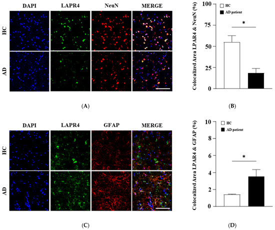 To investigate changes in LPA4 expression in different cell types, we examined co-localization with NeuN (neurons), GFAP (astrocytes), and Iba-1 (microglia) antibodies. As shown in Figure 3A, LPA4 receptor expression was lower in the cortical neurons of patients with AD compared to HCs, as determined by co-localization with NeuN (Figure 3A,B). Interestingly, LPA4 co-localization in cortical astrocytes increased in patients with AD and correlated with elevated GFAP protein expression levels (Figure 3C,D). However, there were no significant changes in LPA4 expression in microglial cells between AD and HC (Figure 3E,F). These results suggest that the reduction in neuron number in patients with AD may be associated with decreased LPA4 expression levels.