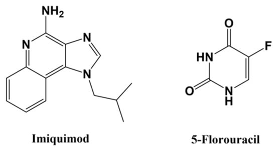 Imiquimod (Aldara; 3M Pharmaceuticals, Figure 1, left and 5-fluorouracil (Adrucil®, 5-FU, Figure 1, right are topical creams applied to BCC lesions for chemotherapeutic treatment. Imiquimod is approved by the Food and Drug Administration (FDA) for treating superficial BCCs less than 2 cm in diameter and is being evaluated for efficacy in nodular BCCs []. Therapeutic effect is achieved through an immune response and induction of apoptosis []. 5-FU is approved by the FDA for the treatment of superficial BCCs. The inhibition of nucleic acid synthesis is the primary mechanism of action. One study reported a 90% cure rate, with patients experiencing minimal side effects []. In both therapies, intense skin reactions are observed due to inflammation caused by imiquimod and lack of tumor specificity of 5-FU [,,]. However, both therapies were found to be most effective when used in conjunction with other treatment options, suggesting that their utility might be optimized synergistically [,]. Topical treatment is ideal for skin cancers- localized delivery minimizes the harm to healthy tissues, specifically parts of the body completely unaffected by cancer. However, superficial BCC represents only 10–30% of the BCC patient population, severely limiting the number of patients who can access these treatments.