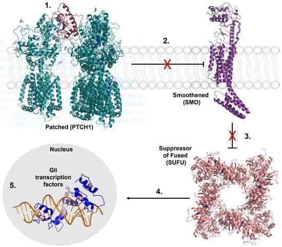 Key regulators of the Hedgehog signaling cascade. 1. Hh signaling is activated by the binding of Hh ligands (Sonic Hedgehog, Indian Hedgehog, and Desert Hedgehog) to the transmembrane protein PTCH1. 2. PTCH1 is a suppressor of SMO activity. Upon the binding of Hh proteins, inhibition of SMO is released, represented by the red X. 3. Upon activation, SMO signals for the SUFU complex to release the Gli family of transcription factors. 4. Gli transcription factors are activated in the cytosol prior to translocating into the nucleus. 5. Gli transcription factors transcribe pro-proliferative and migratory genes that lead to tumorigenesis in BCC. Crystal structures images were made from the following Protein Data Bank files: Ptch1/SHH complex, 6N7H. SMO, 6D35. SUFU/Gli complex: 4BLB. Gli1/DNA complex, 2Gli.