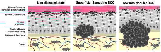 Cartoon representation of epidermal layers and the growth of BCC. Tumor cells originate from the stratum basale where they maintain stemness and hyperproliferative capacity. As the tumors progress, they begin to spread and migrate into the dermis as well as alter the pathology of non-tumor keratinocyte differentiation.